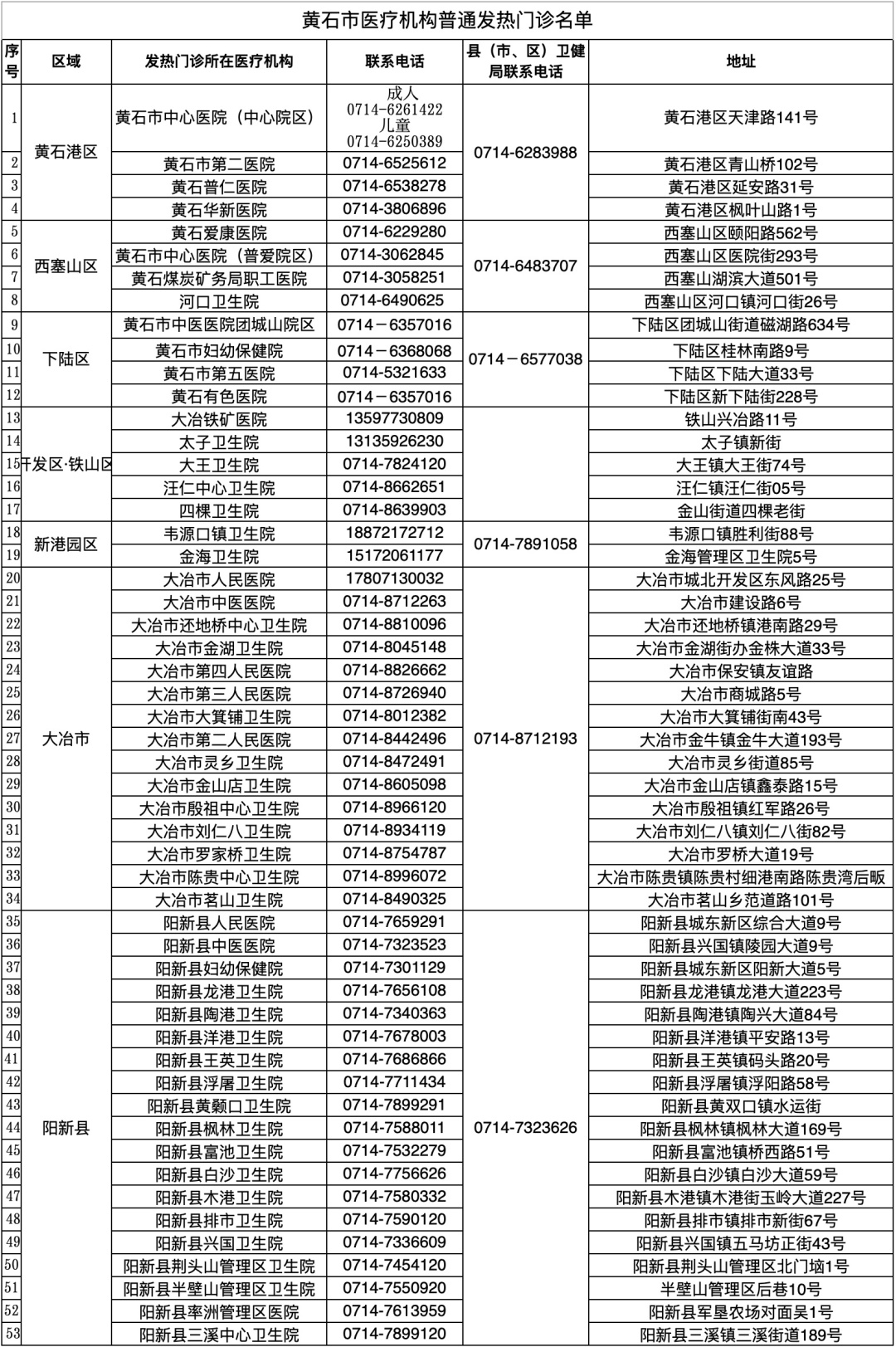 全市53家医疗机构普通发热门诊名单