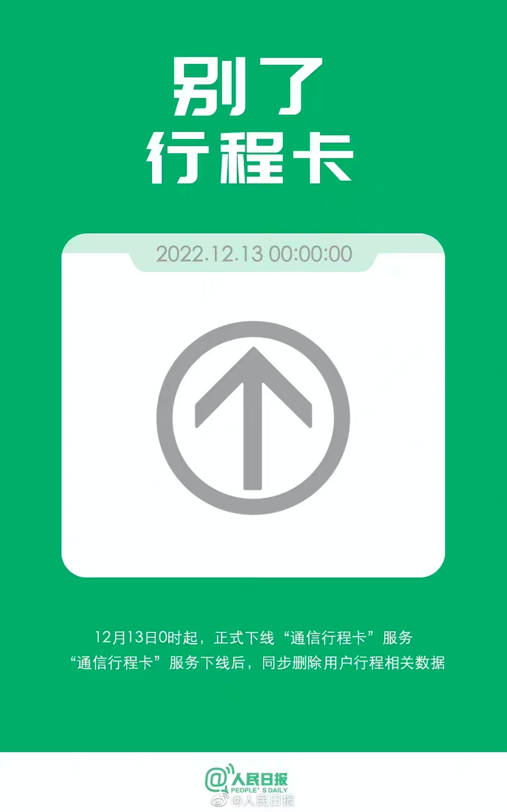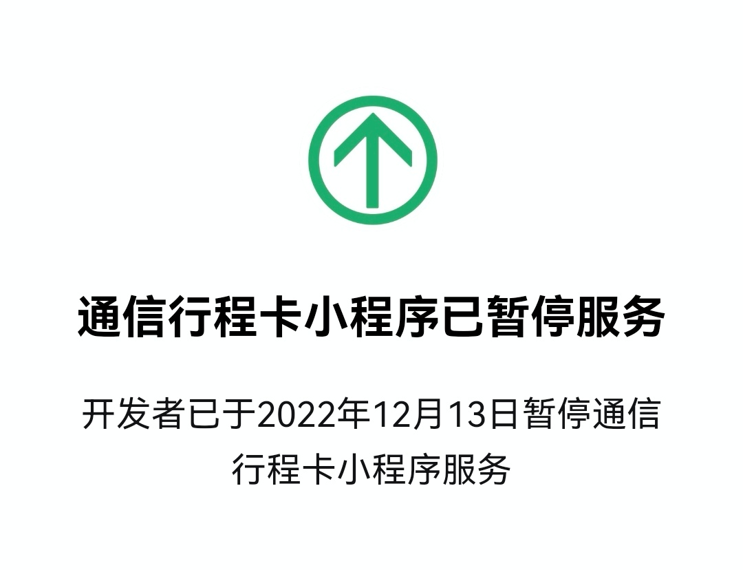 12月12日,据“通信行程卡”微信公众号消息,12月13日0时起,正式下线“通信行程卡”服务。“通信行程卡”短信、网页、微信小程序、支付宝小程序、 APP等查询渠道将同步下线。
