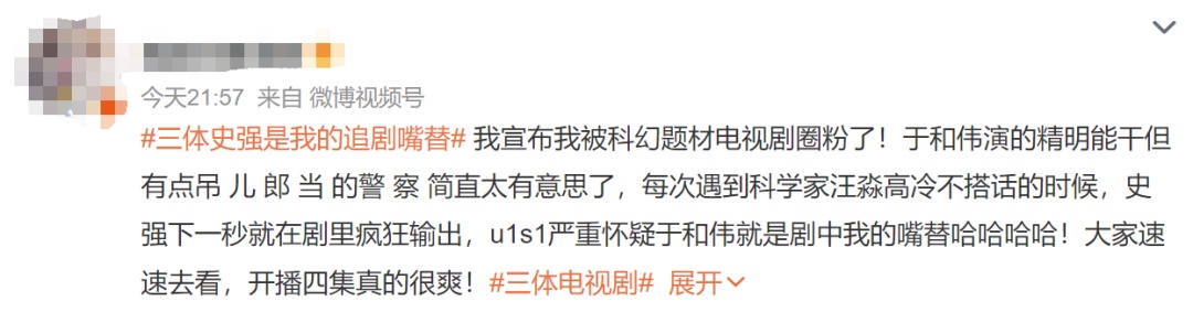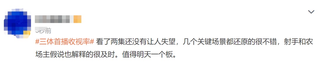 “三体第一集不错,忠于原著,难得。但是好像有点过于忠于原著了,不好说,继续观望。”微博用户@江宁婆婆写道。