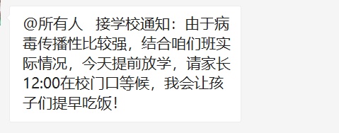 昨天(2月20日)早上,一张截图在部分金华市民朋友圈中传播。金华一学校发布了提前放学通知:“由于病毒传播性比较强,结合咱们班实际情况,今天提前放学,请家长12:00在校门口等候。”