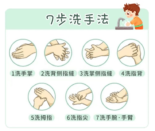 饭前、便后、加工食物前应按照7步洗手法正确洗手,用肥皂和流动水至少洗20秒,但需注意,含酒精消毒纸巾和免洗手消毒剂对诺如病毒无效,不能代替洗手。