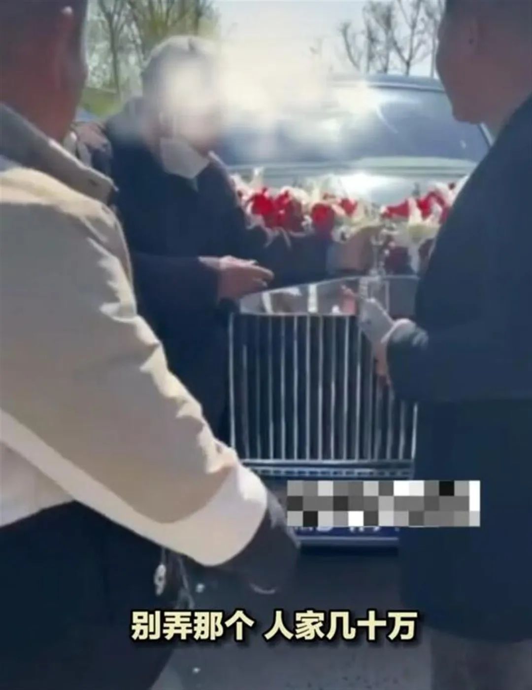 现场视频显示,一队婚车停在乡道上,车队最前方,一男子推着一辆自行车横在路上,几人正与其交涉。另一段视频显示,男子用手握住劳斯莱斯车的车标,并称要烟。视频中有人对他说:“别弄那东西,几十万呢!你过来我给你。”