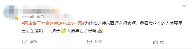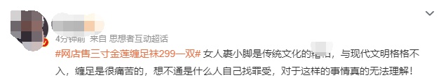4月12日,#网店售三寸金莲缠足袜299一双#话题登上微博热搜榜首,引发网友热议。