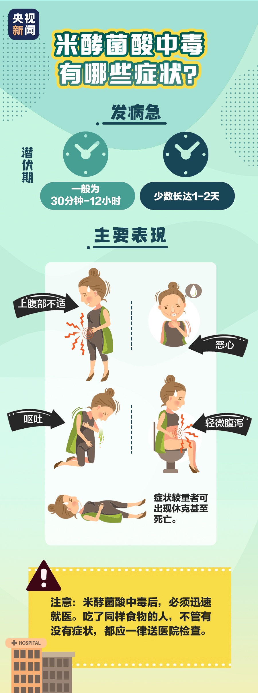 中毒者有急性胃肠炎症状,临床表现为进食后2至24小时出现上腹不适、恶心、呕吐,重者呈咖啡色样物,轻微腹泻、头晕、全身无力等。