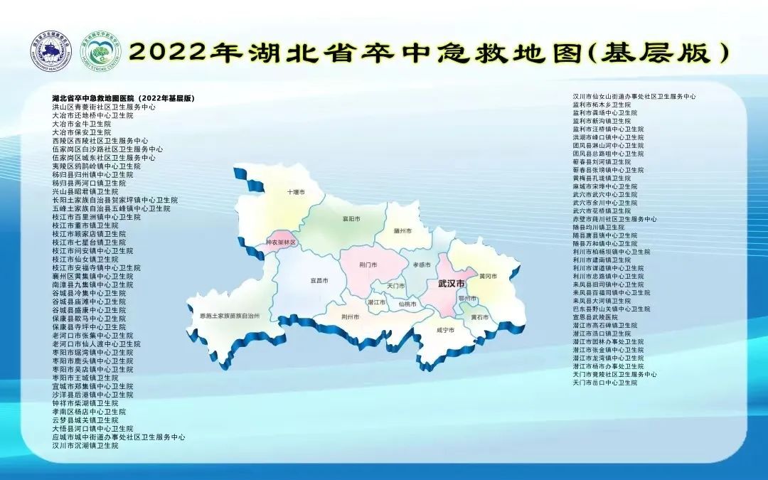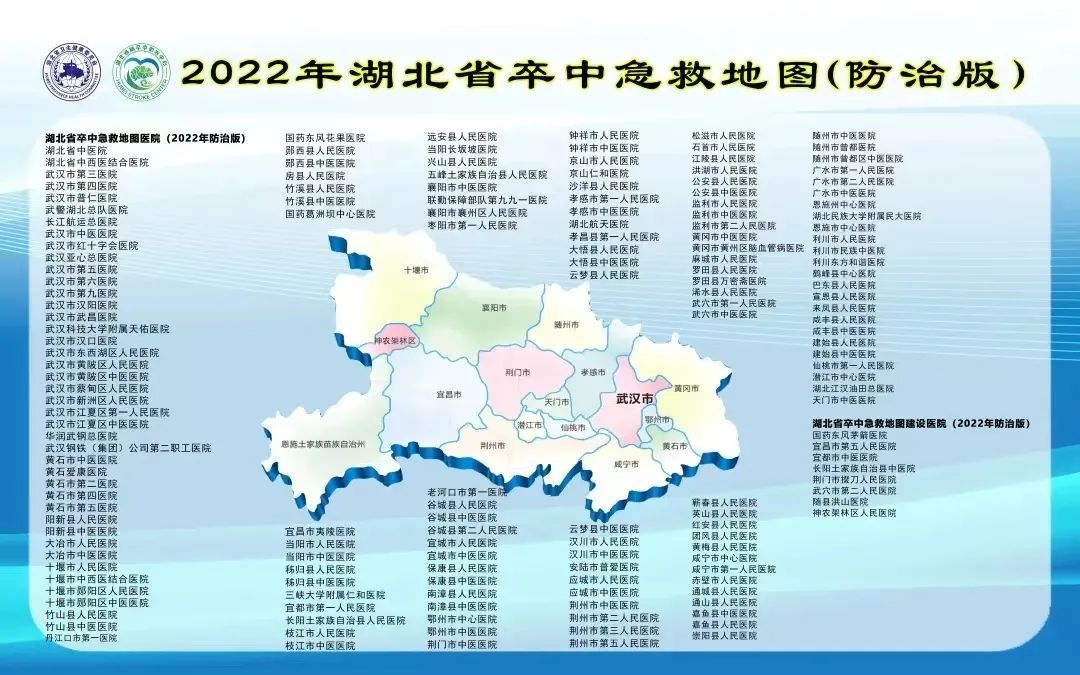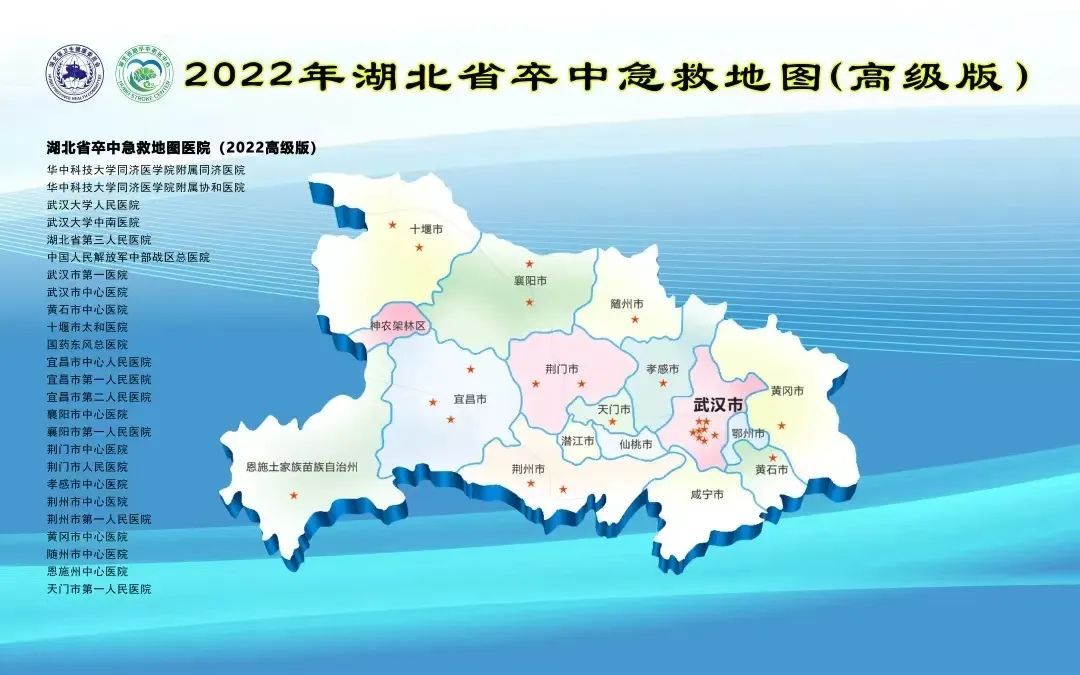 近日,新版2022年湖北省卒中急救地图在武汉正式发布。新版急救地图包括高级版、防治版和基层版,其中,25家医院为2022年湖北省高级版卒中急救地图医院;156家医院为防治版卒中急救地图医院、8家医院为防治版卒中急救地图建设医院;77家医院为基层版卒中急救地图定点医院。