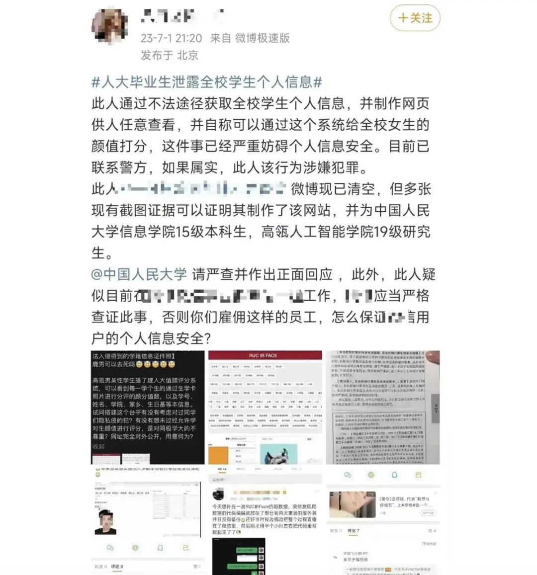 有网友在微博上爆料称,中国人民大学一男生在读硕士研究生期间,利用专业技术盗取全校学生个人信息,包括照片、姓名、学号、籍贯、生日等,并搭建了给全校学生颜值打分的网站。该毕业生还曾在个人社交账号上发布动态公开此事。网传截图显示,该动态发布于2020年10月。但记者发现,目前其社交账号上相关内容已经清空。