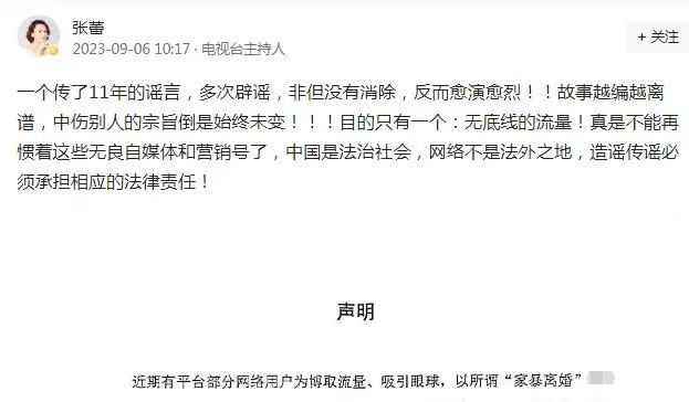 昨日(6日),主持人张蕾在社交平台发布了一则声明,并配文:“一个传了11年的谣言,多次辟谣,非但没有消除,反而愈演愈烈,故事越编越离谱,中伤别人的宗旨倒是始终未变......网络不是法外之地,造谣传谣必须承担相应的法律责任。”