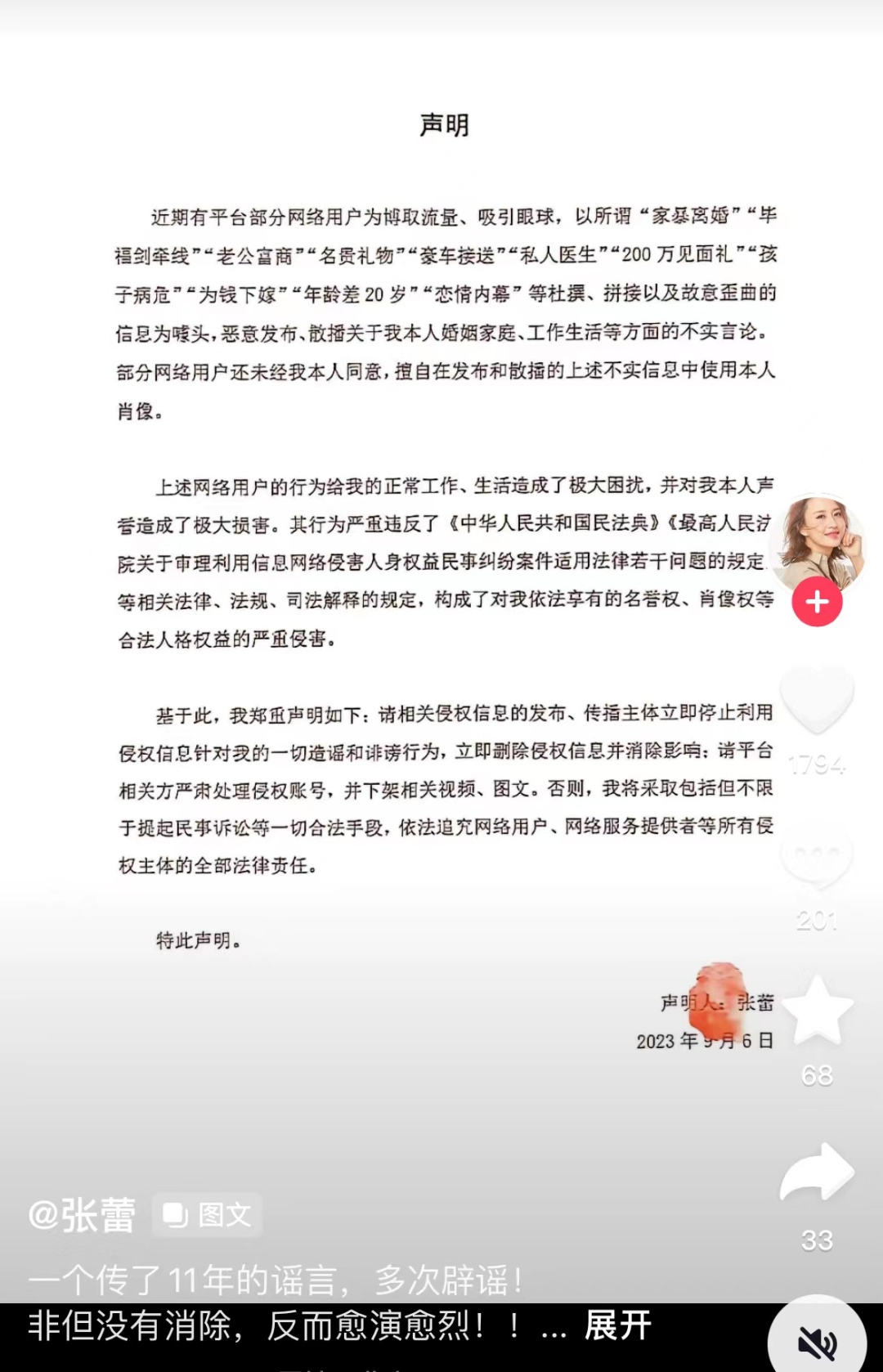 在声明中,张蕾否认了网传的“家暴离婚”“老公富商”“孩子病危”等谣言,并请相关侵权信息的发布传播主体立即停止利用侵权信息针对她的一切造谣和诽谤行为,立即删除侵权信息。否则,她将采取一切合法手段,依法追究所有侵权主体的全部法律责任。