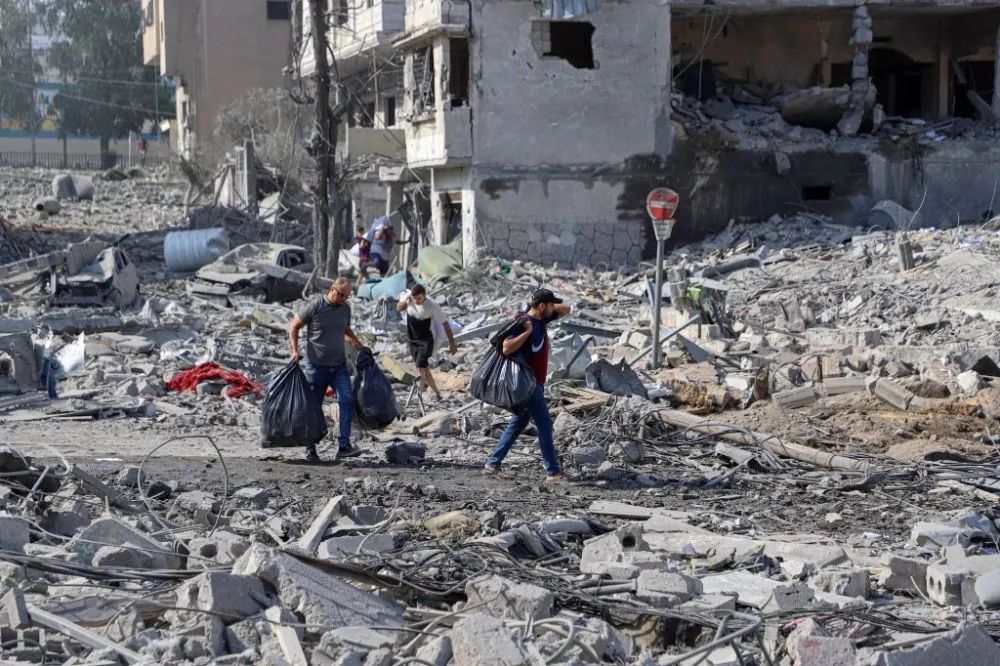 10月10日,在加沙城,人们走过被以色列空袭炸毁的建筑废墟。新华社发