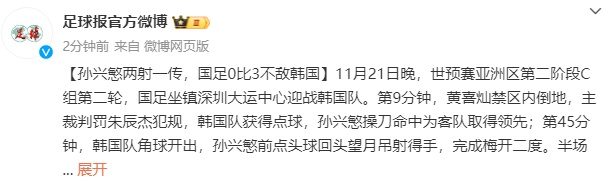 11月21日晚,世预赛亚洲区第二阶段C组第二轮,国足坐镇深圳大运中心迎战韩国队。第9分钟,黄喜灿禁区内倒地,主裁判罚朱辰杰犯规,韩国队获得点球,孙兴慜操刀命中为客队取得领先;第45分钟,韩国队角球开出,孙兴慜前点头球回头望月吊射得手,完成梅开二度。半场战罢,国足0比2落后韩国。
