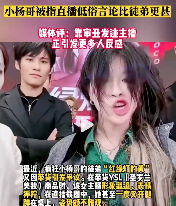 最近,疯狂小杨哥的徒弟“红绿灯的黄”又因带货引发争议。在带货YSL(圣罗兰美妆)商品时,该女主播形象邋遢、表情狰狞,在直播截图中,她甚至一度叉开腿蹲在桌上,姿势颇不雅观。