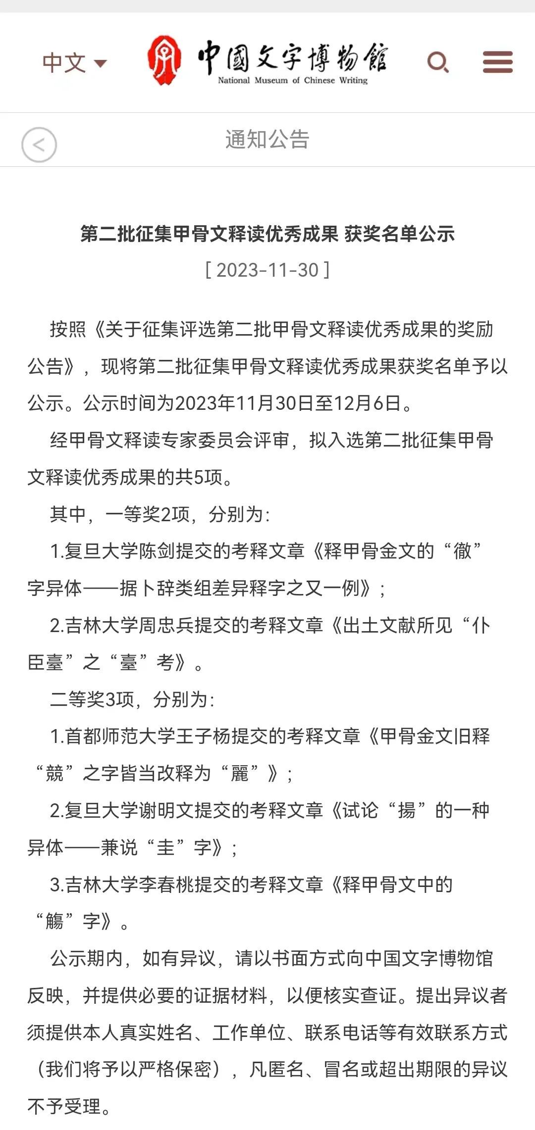 11月30日,中国文字博物馆公示了第二批征集甲骨文释读优秀成果获奖名单↓↓