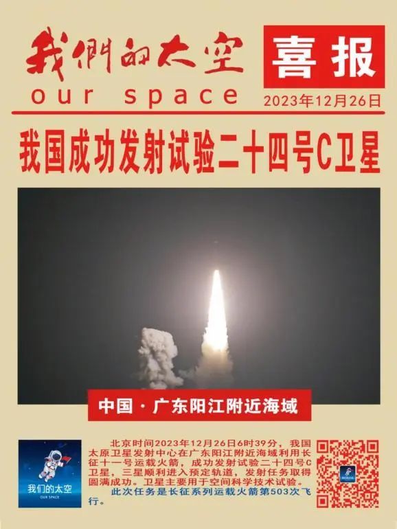 12月26日6时39分,我国太原卫星发射中心在广东阳江附近海域利用长征十一号运载火箭,成功发射试验二十四号C卫星,三星顺利进入预定轨道,发射任务取得圆满成功。