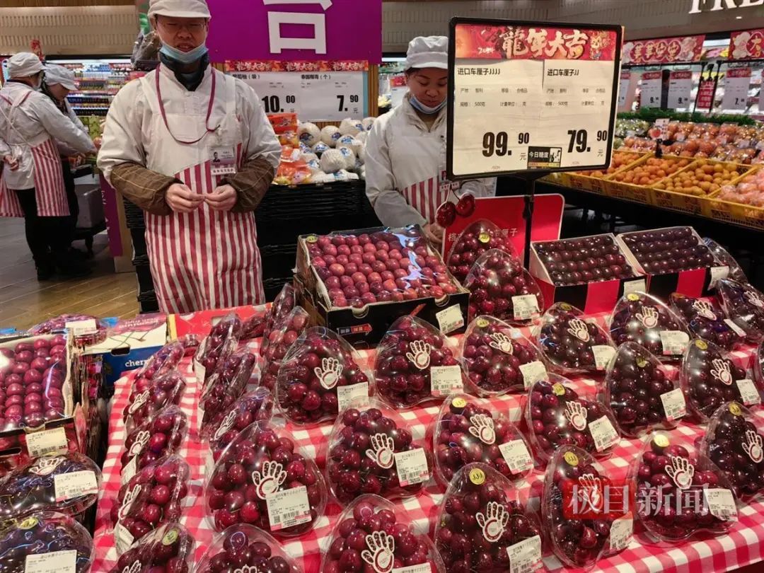 1月4日上午,当记者来到汉口兴业路的一座大型连锁超市时,水果区里的工作人员正在将分装完毕的车厘子进行码堆,同时更换了新的价签。