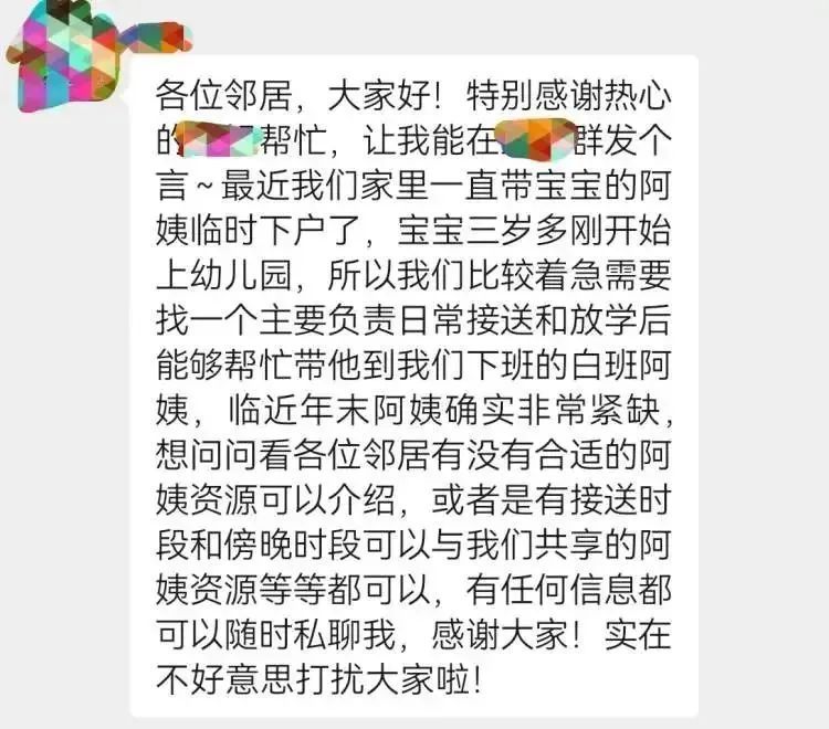 近期,上海张女士家中带宝宝的阿姨突然离职,但因为临近年末,家政人员非常紧缺,她联系了所有认识的家政公司也没能找到顶替的阿姨。无奈之下,张女士加入小区各种微信群找“共享阿姨”。