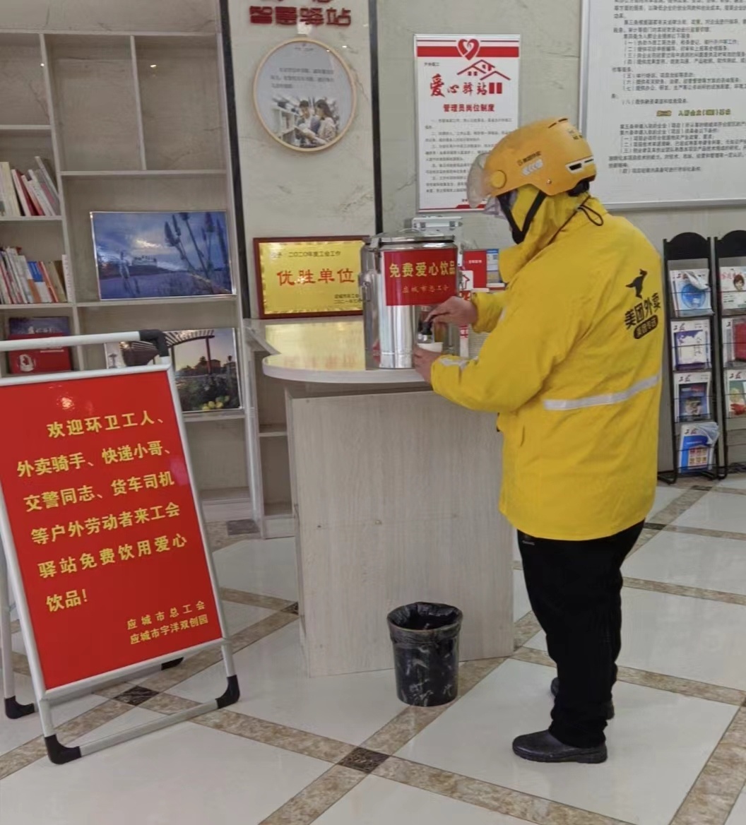 2月20日起,在应城市总工会、宇洋双创园、天黎物流园等地的工会驿站内,纷纷新添了贴有“爱心热饮”字样的保温桶供应姜茶,并在门口设立醒目标识牌,方便户外劳动者、过往行人取用。