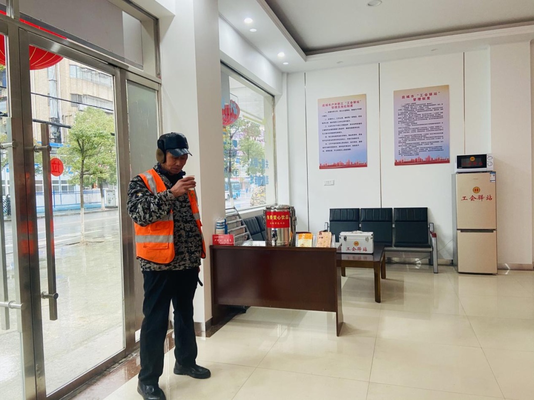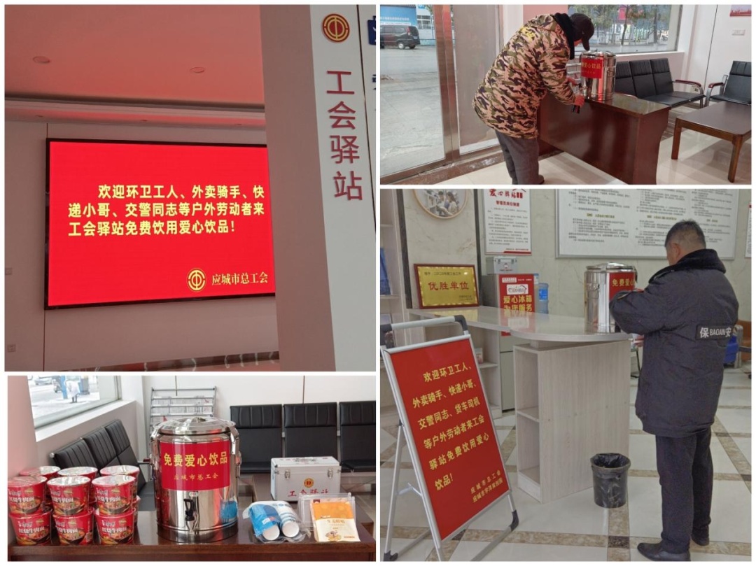 为应对新一轮寒潮,应城市总工会第一时间向全市各级工会组织和各工会驿站共建单位发出号召,充分发挥工会“娘家人”的暖心作用,通过开放暖气,免费提供姜茶热饮、暖宝宝等爱心御寒物资,为奋战在严寒天气下的户外劳动者们歇脚休息营造温暖舒适的环境,把暖心服务送到他们的心坎里。