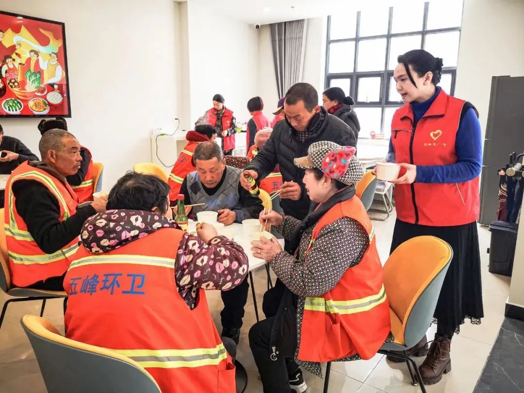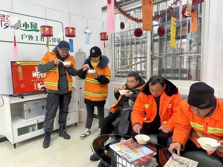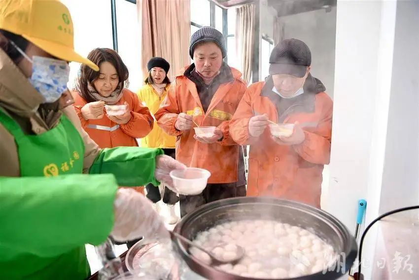 大家将汤圆煮好,邀请在爱心驿站休息的环卫工人品尝,并为他们送上节日祝福。环卫大姐高兴地说:“虽然今天下着大雪,但是吃上一碗汤圆,心里暖融融的,让我们感受到工会‘娘家人’的关心!”