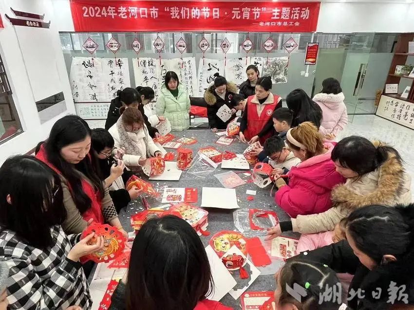 老河口市临江社区爱心驿站内,市总工会志愿者带领职工群众及子女了解元宵节的风俗习惯并亲手制作花灯,大小朋友们互相探讨交流,现场气氛热闹又温馨。做完花灯,大家开始包汤圆,揪面剂,包馅搓团……大手带着小手经过一系列的工序后,一个个圆滚滚、白胖胖的汤圆就诞生了。