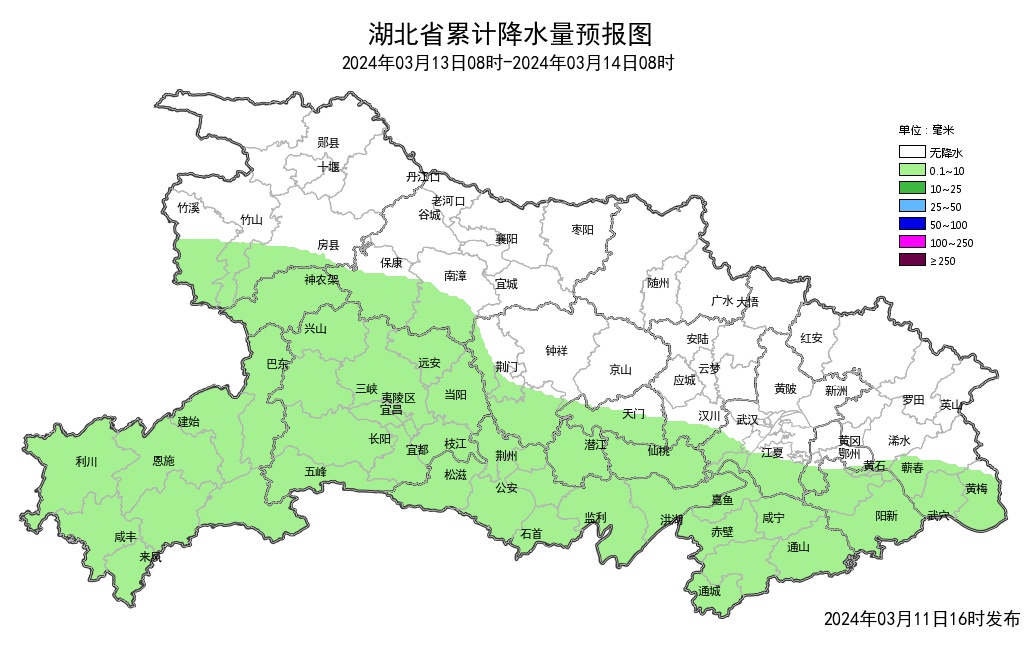 3月13日08时-14日08时,鄂西北南部、鄂西南、江汉平原南部、鄂东南阴天有短时小雨;其他地区阴天到多云。最高气温鄂西南11~14℃、其他地区14~18℃,最低气温5~9℃,偏东风2到3级。