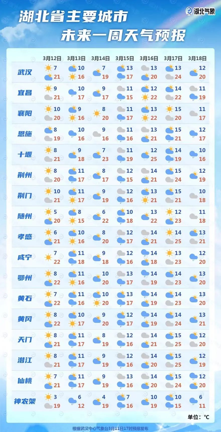 3月12日08时-13日08时,全省晴天到多云,夜间鄂西北南部和鄂西南有短时小雨。最高气温19~23℃,最低气温7~11℃,偏东风3到4级、阵风5到6级。