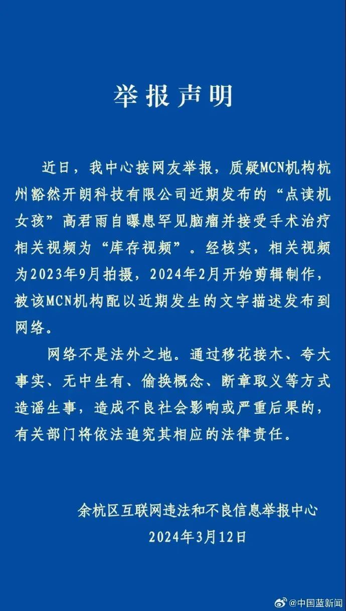 余杭区互联网违法和不良信息举报中心12日发布声明称,近日,接网友举报,质疑MCN机构杭州豁然开朗科技有限公司近期发布的“点读机女孩”高君雨自曝患罕见脑瘤并接受手术治疗相关视频为“库存视频”。经核实,相关视频为2023年9月拍摄,2024年2月开始剪辑制作,被该MCN机构配以近期发生的文字描述发布到网络。