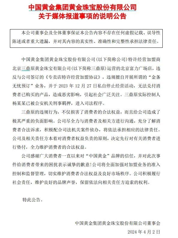 公告称,公司特许经营加盟商北京三鼎原黄金珠宝有限公司(以下简称三鼎原)运营的北京富力广场店,违反与公司签订的《专卖店特许经营加盟协议》,违规擅自开展所谓的“金条无忧预订”业务,并于2023年12月27日私自停止经营活动,无法兑付消费者已购买的产品,造成恶劣影响,引起社会广泛关注。三鼎原实际控制人杨某某已被公安机关刑事羁押,进入司法程序。
