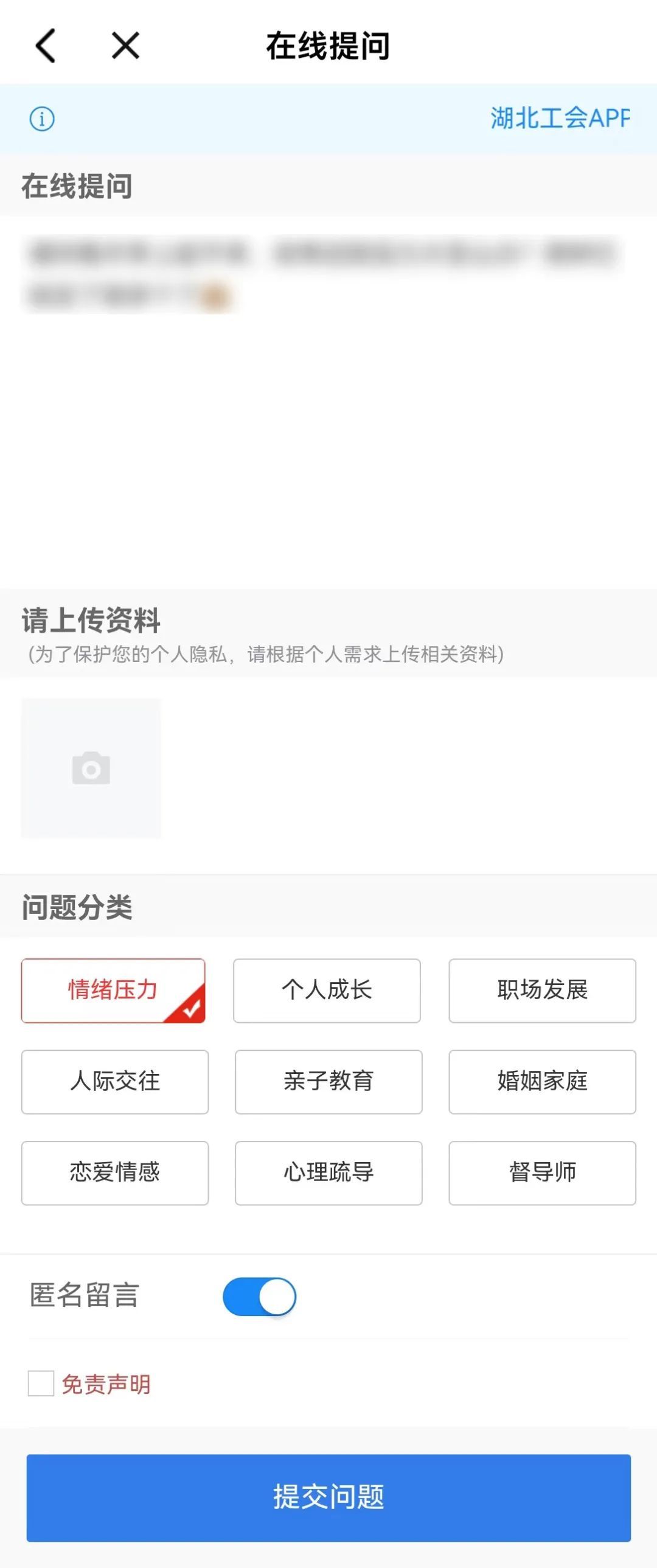 在“心理关爱”专区,点击“我要提问”,按提示填写提问内容,上传补充材料,选择问题分类及是否匿名留言,确认“免责明”,“提交问题”即可。