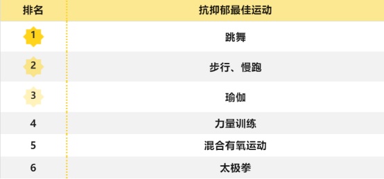 据了解,该研究纳入包括14170名受试者,对每项试验进行评估并记录运动的类型、强度和频率。根据运动表现出对抑郁的治疗效果,选出了对抗抑郁最好的几种运动。