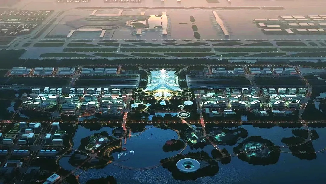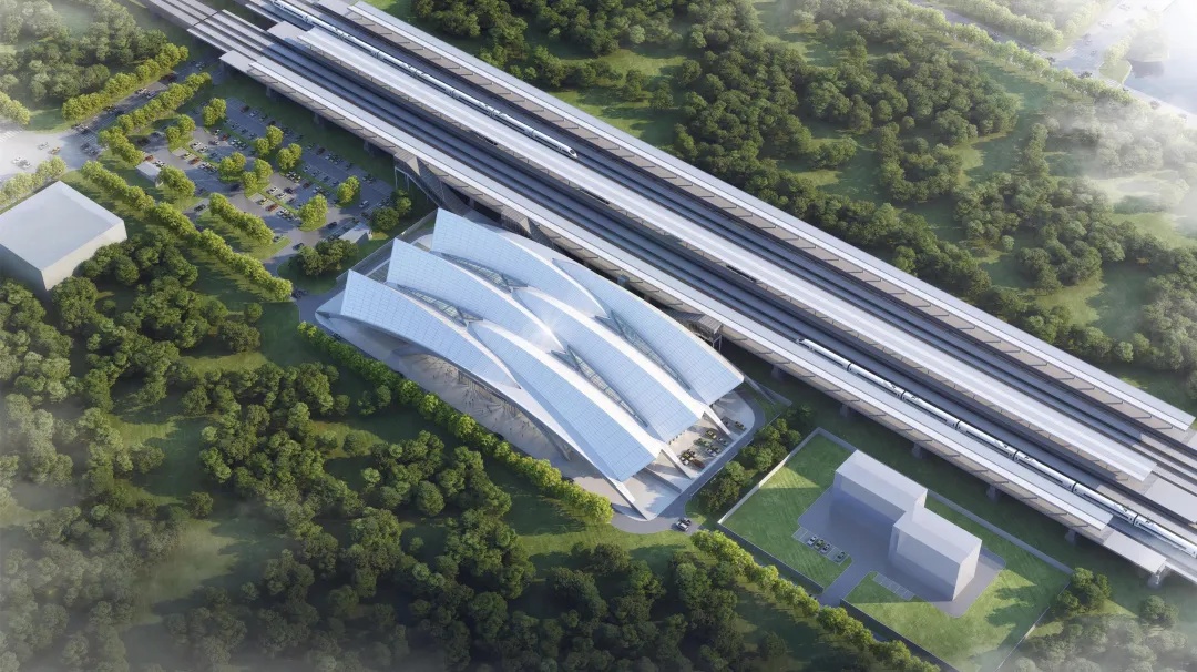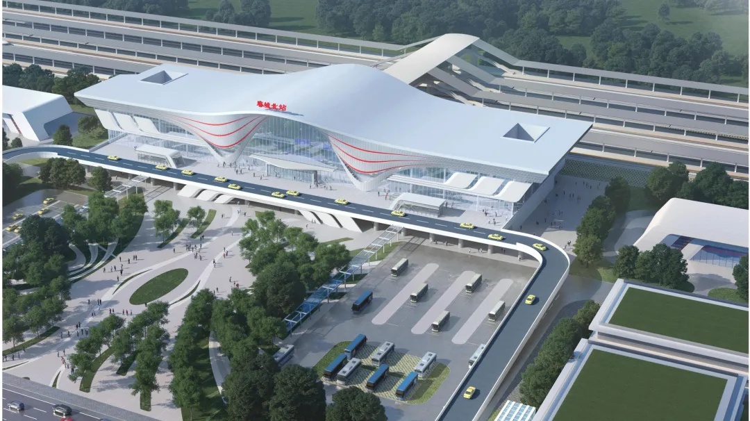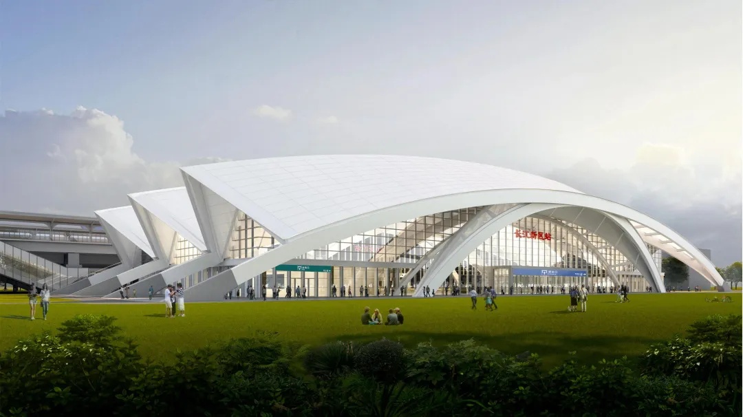 长江新区站站房以“江豚逐浪”为设计理念,站房设计提取江豚追逐嬉戏的元素,以数条江豚交织跃水的姿态为站房形象。