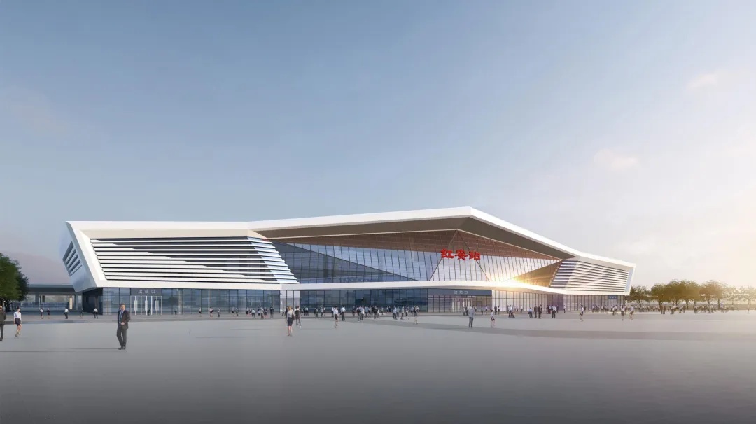 红安站站房以“红色胜地,将星故里,星耀红安”为设计理念,设计方案结合铁路站房的空间特色,形成中间候车厅高、两侧配套用房低的形态,彰显红安“第一将军县”深厚的红色文化和朴诚勇毅的革命精神。站房入口部分整体较凸出,幕墙形成三角折面,勾勒出抽象的“五角星”形态。站房整体形象端庄大气,极具视觉冲击力。