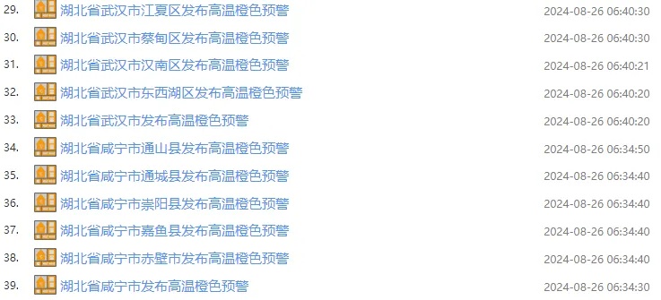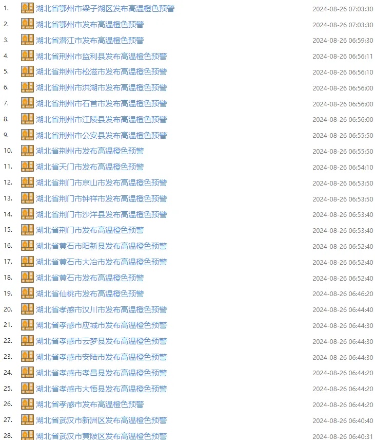 除了武汉,8月26日,湖北多地再发高温橙色预警,涉黄石、鄂州、荆州、荆门等地,局地达40℃以上。