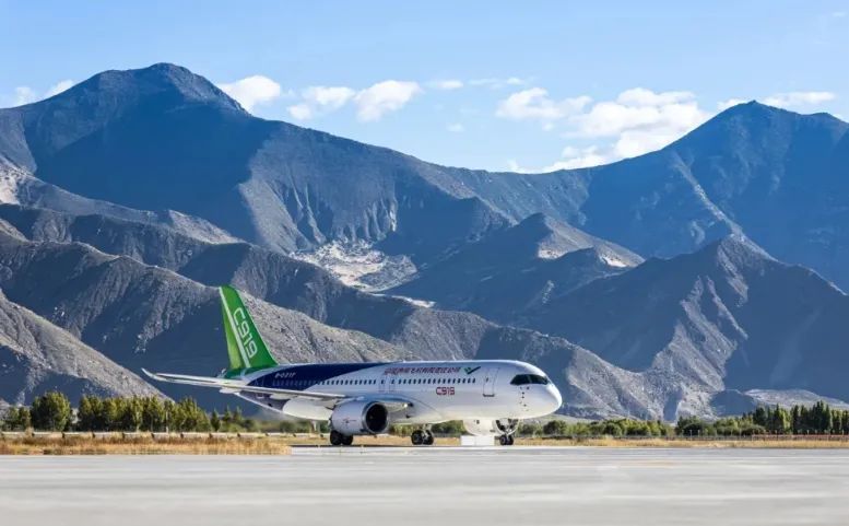 9月19日,中国商飞公司一架C919飞机从四川成都双流国际机场起飞,经过2小时8分钟飞行,平稳降落在西藏拉萨贡嘎国际机场。这是C919飞机首次飞抵拉萨。