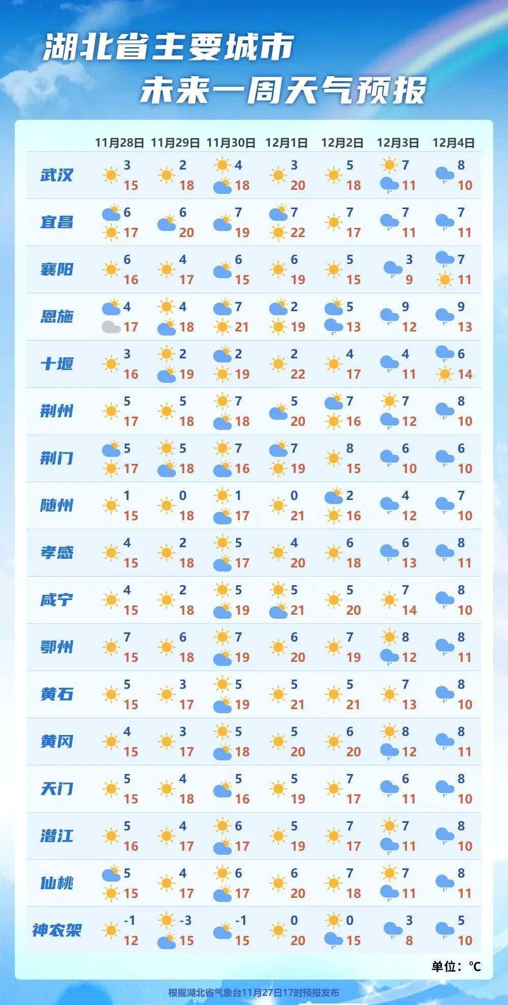 预计至本周末,湖北都将以晴到多云天气为主,早晨局地有雾。气温也将继续升高,最高气温将达到17℃~21℃。但需要注意的是,早晚依然较为寒凉,北部最低气温在-3℃~3℃,南部在4℃~8℃,提醒大家早晚注意添衣保暖;昼夜温差较大,可以采用洋葱式穿衣法,以便穿脱。