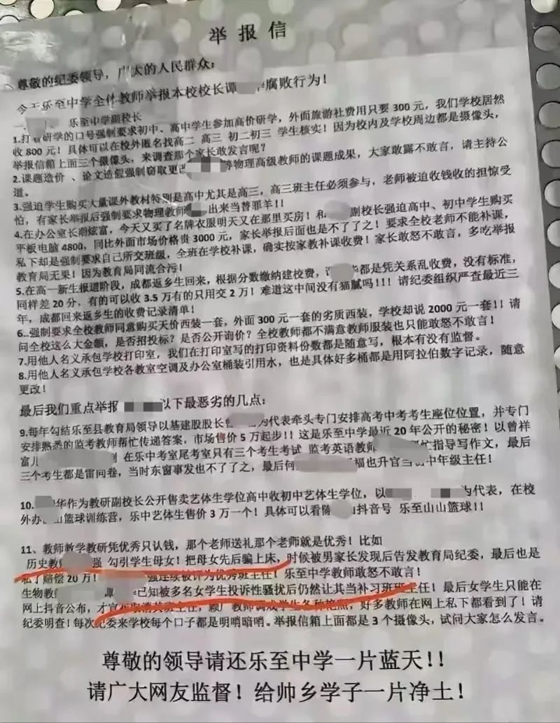 近日,一份四川省资阳市乐至中学全体教师举报该校副校长谭某华的举报信引发关注,举报信中列举了其涉嫌论文造假、考试作弊、乱收费等诸多问题。