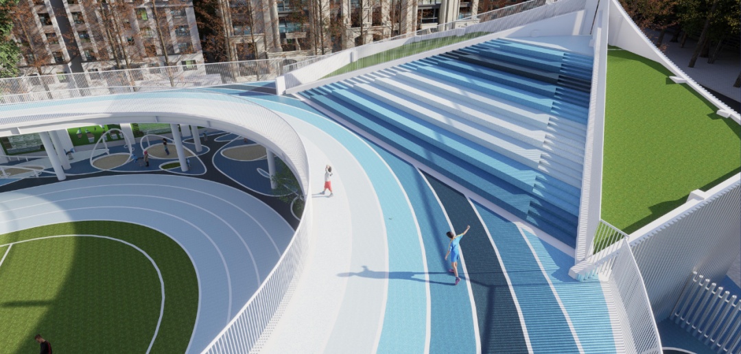 在前期勘察中,设计团队发现,孩子们课间休息须下楼到一层,短短10分钟跑上跑下,时间紧张。为破解这一难题,此次改造还将在两个学校教学楼的二楼,各打造一个悬浮的“空中平台”,将学校内原本各不相关的场地整合成一体。