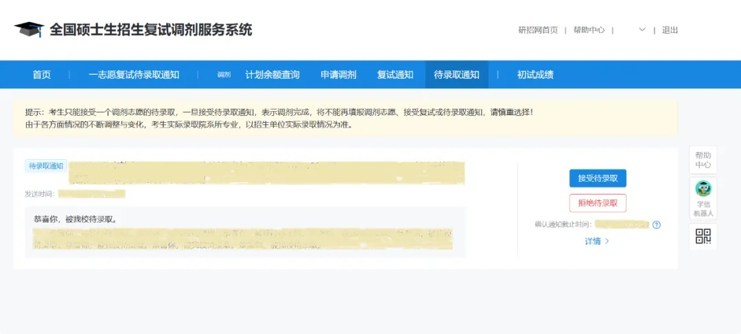 考生只能接受一个调剂志愿的待录取,一旦接受待录取通知,表示调剂完成,将不能再填报调剂志愿、接受复试或待录取通知,请慎重选择!
