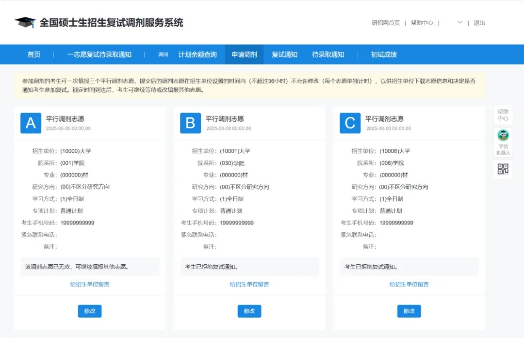 如需修改调剂志愿,可点击“修改”按钮进入修改调剂志愿页面进行修改,修改后点击“提交”按钮即可。