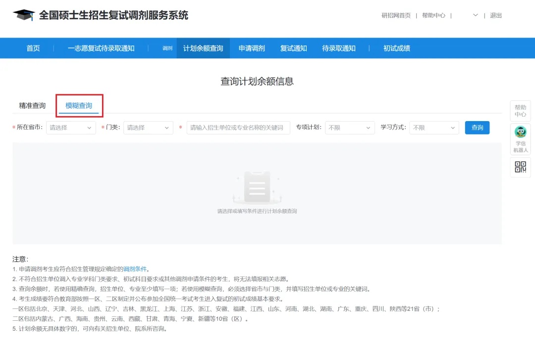 3.查询余额时,若使用精确查询,招生单位、专业至少填写一项;若使用模糊查询,必须选择省市与门类,并填写招生单位或专业的关键词。
