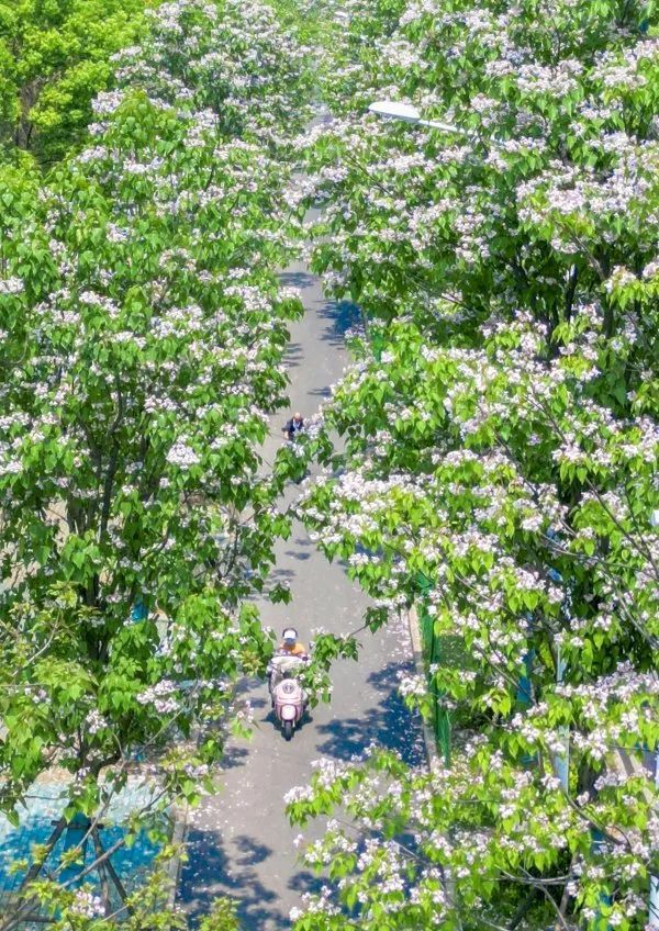 每年4月,楸树开满淡红色的喇叭状花朵,形成楸花夹道美景;夏天,沿街挂满青“豆角”,形成壮观的“果瀑”景观,吸引不少市民打卡拍照。