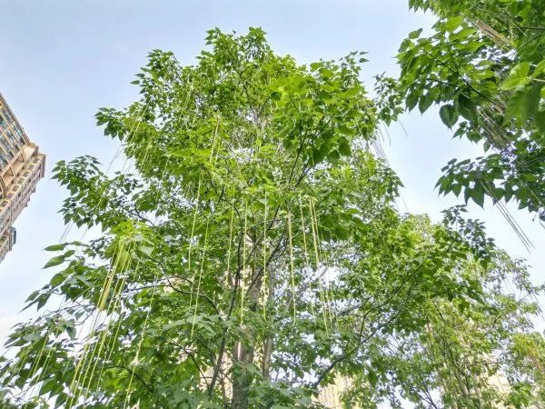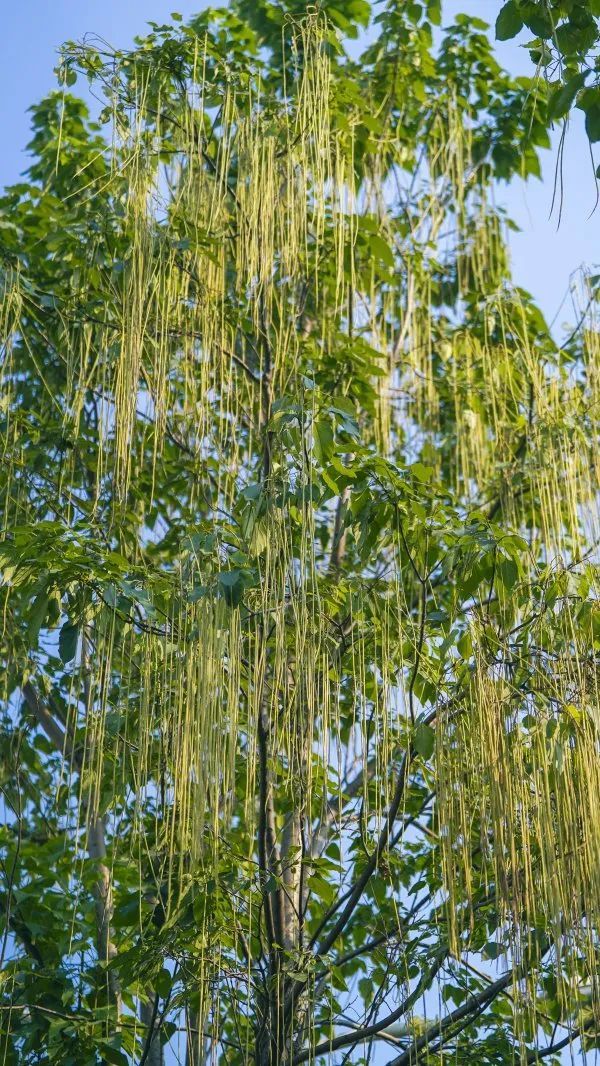 铁机路楸树上挂满瀑布似的长“豆角”。