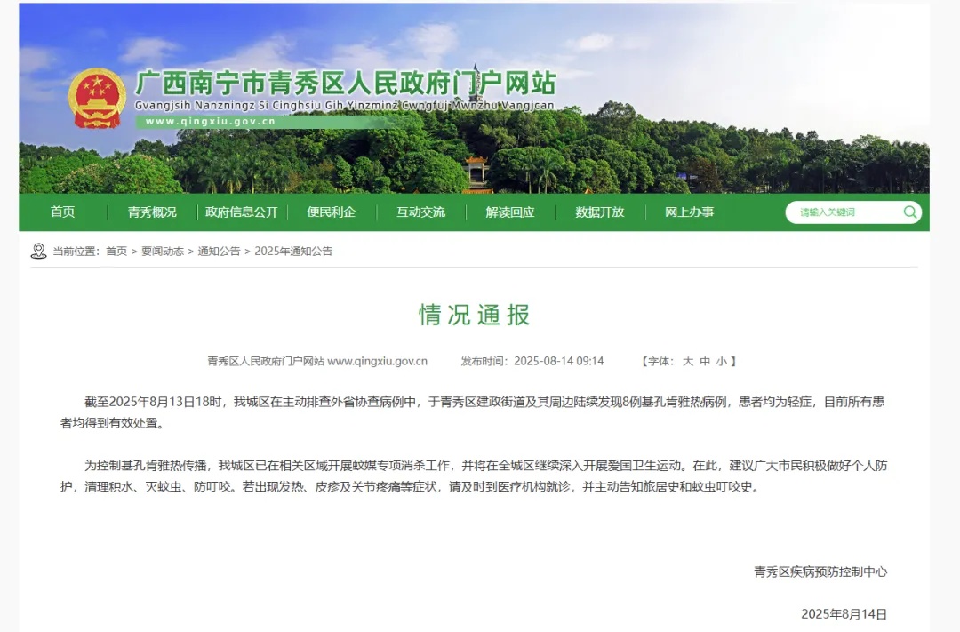 截至2025年8月13日18时,城区在主动排查外省协查病例中,于青秀区建政街道及其周边陆续发现8例基孔肯雅热病例,患者均为轻症,目前所有患者均得到有效处置。