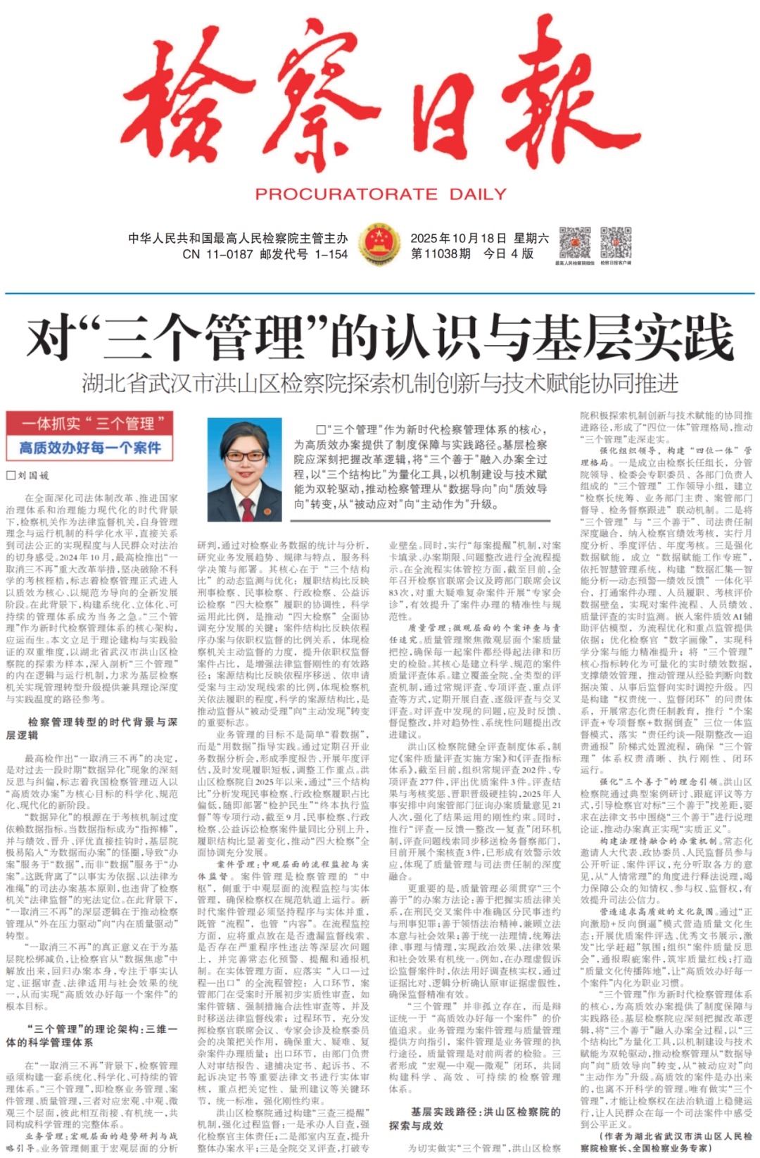 在全面深化司法体制改革、推进国家治理体系和治理能力现代化的时代背景下,检察机关作为法律监督机关,自身管理理念与运行机制的科学化水平,直接关系到司法公正的实现程度与人民群众对法治的切身感受。2024年10月,最高检推出“一取消三不再”重大改革举措,坚决破除不科学的考核桎梏,标志着检察管理正式进入以质效为核心、以规范为导向的全新发展阶段。在此背景下,构建系统化、立体化、可持续的管理体系成为当务之急。“三个管理”作为新时代检察管理体系的核心架构,应运而生。本文立足于理论建构与实践验证的双重维度,以湖北省武汉市洪山区检察院的探索为样本,深入剖析“三个管理”的内在逻辑与运行机制,力求为基层检察机关实现管理转型升级提供兼具理论深度与实践温度的路径参考。