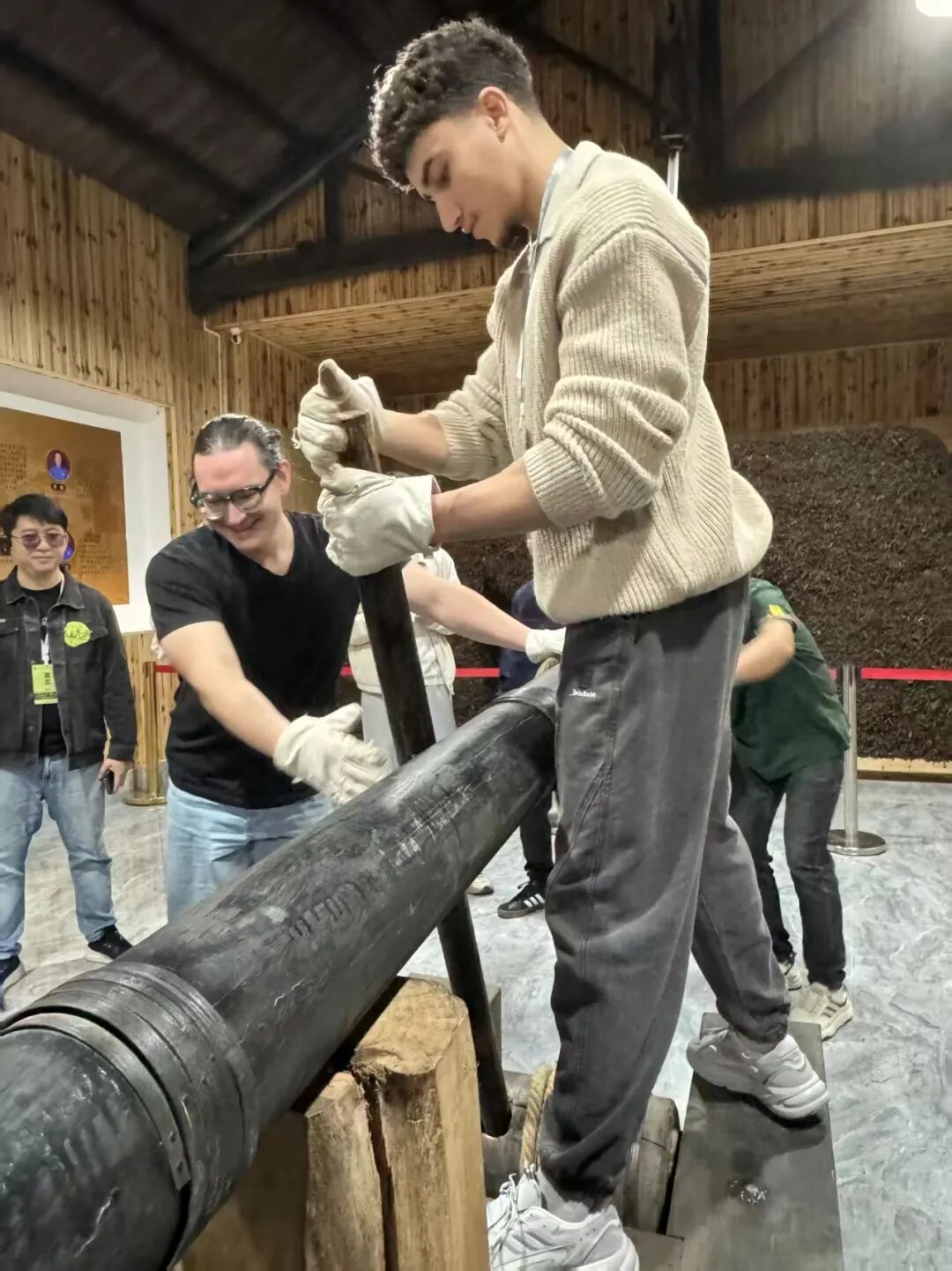 留学生在中国青砖茶非遗技艺传承馆体验压制青砖茶。