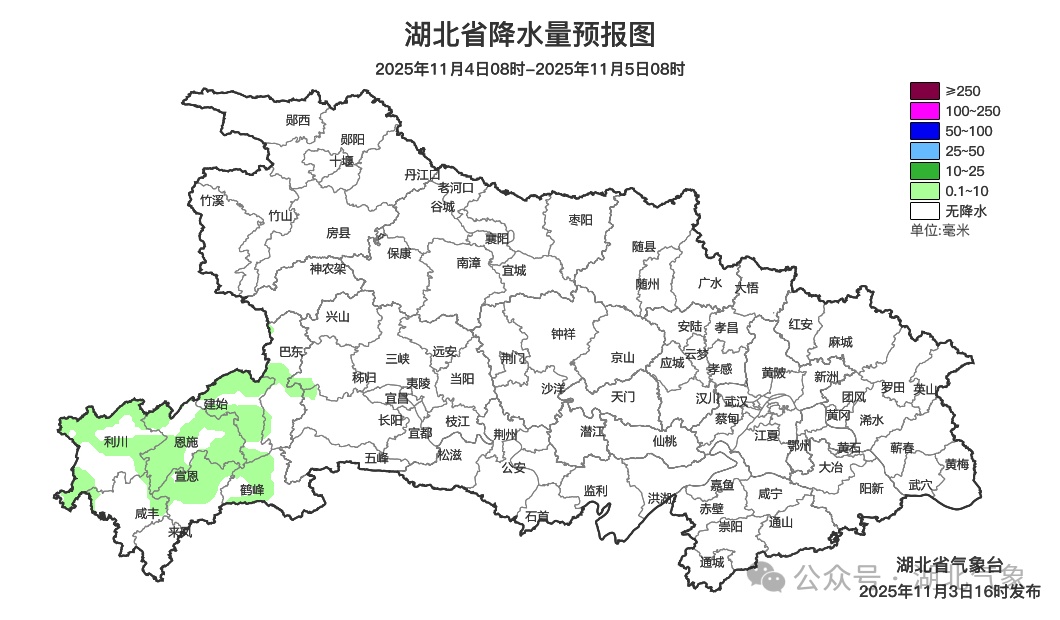 11月3日20时-4日08时,鄂西南阴天有小雨;其他地区多云。最低气温北部8~11℃、南部11~15℃,偏东风2到3级。
