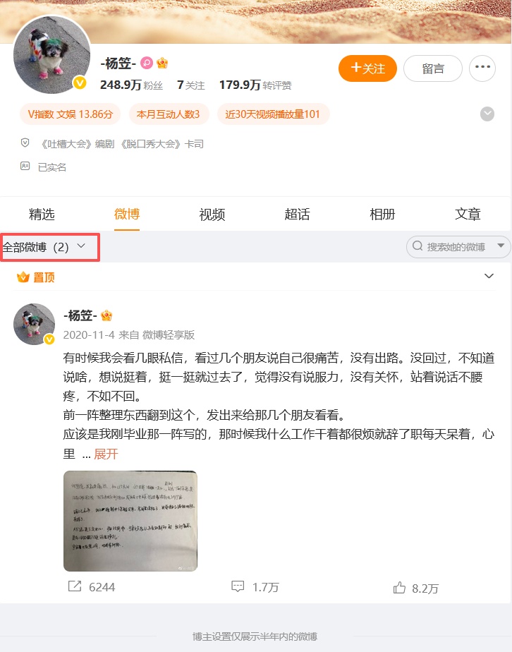 此外,记者查询发现,其微博账号内容也仅剩两条,除了置顶微博外,并无可查看内容。