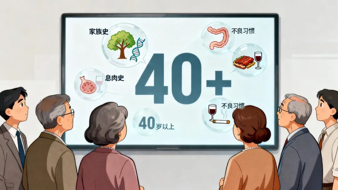 年龄是重要因素。中国人群肠癌发病率从40岁开始明显上升。《中国结直肠癌早诊早治专家共识(2023版)》建议40—74岁普通人群进行肠镜检查。