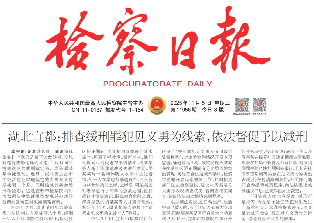 今年3月初,宜都市检察院自行研发了“缓刑罪犯见义勇为适用减刑监督模型”,对该类案件情况开展专项监督。通过数据比对,该院发现周某某在接受社区矫正期间有见义勇为的突出表现,可能符合法定减刑条件。检察官随即开展线索初核工作,并向相关部门送达检察建议,建议对周某某见义勇为表现调查核实,若调查核实属实,建议依法启动提请减刑程序。
