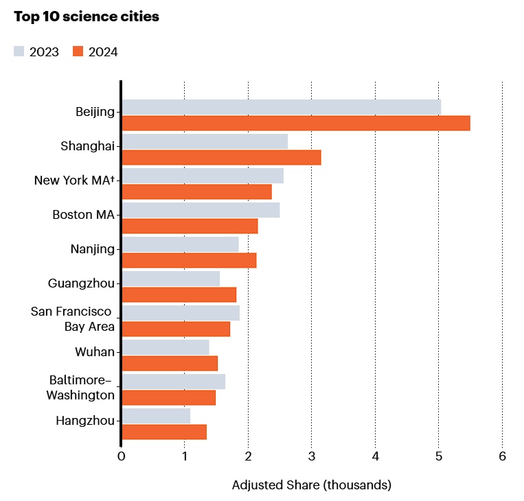 此次排名追踪了各城市在高质量自然科学期刊上的科研产出。除北京、上海稳居前列外,南京、广州、武汉、杭州跻身全球十强。增刊还分析了学科表现,中国城市在化学、物理科学、地球与环境科学领域优势明显,甚至首次包揽化学领域全球前十。其中,武汉在物理科学、化学和地球与环境科学领域分别高居全球第4、第5和第6位,显示出雄厚的综合科研实力。