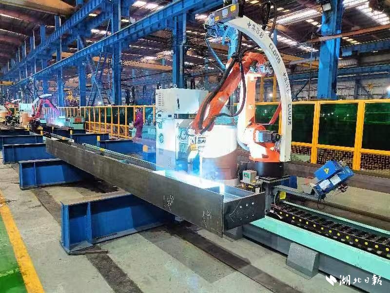 湖北鸿路钢构有限公司生产车间,焊花飞溅、弧光闪烁。 (湖北日报客户端通讯员 汪能 摄)